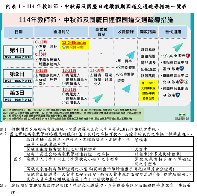 114年教師節、中秋節及國慶日連假國道車多 高公局將進行交通疏導措施