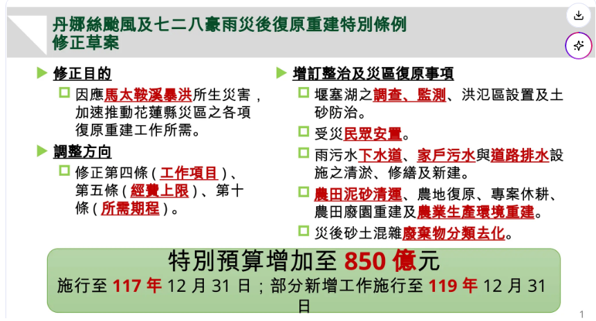 加速進度、擴大支持 政院修正「丹娜絲災後復原重建特別條例」部分條文