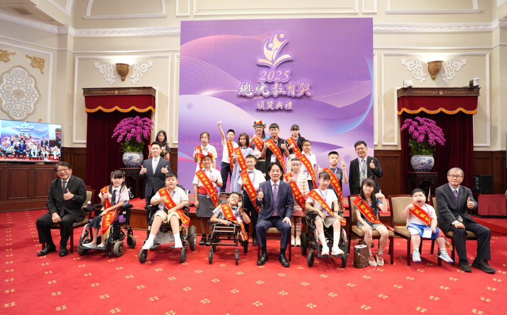 隨後,賴總統一一頒獎予獲獎同學。「2025總統教育獎」得獎同學包括國小組:方珩、王諄、陳秉希、羅弘輔、李奕霈、尹雅汕、許知貽、蘇翊捷、曾盼儒、康晉豪、吳昌玹、許博彥、汪麗晴、汪佑叡、潘聖捷、黃昊恩、曾釩銨、李婭晨等18名;國中組:謝昇舜、王潔沂、吳承翰、何亭維、陳婕渝、連沛瑜、曾祈恩、楊貴東、陳宥穎、田萱、謝至程、游佩璇、林言彤、董晏鈞、莊凱丞、潘梓宣、邱奇希、劉玉婷等18名;高中組:王實修、王辰瀚、林佳勳、蔡秉澄、吳俊佑、彭宥彤、林歆璇、莊宇僑、陳柏呈、翼友福、林宇涵、劉嘉欣、盧琮鈞、陳詩涵等14名;大專組:許樂、鄭漢琮、林亭萓、林育夙、賴欣儀、鄭成鼎、許汯洧、林宸緯、詹博丞、蔡奕琳等10名。2025/07/04