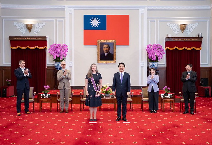 賴總統致詞時表示,今天很高興代表中華民國政府與人民,頒授「大綬景星勳章」予AIT台北辦事處孫曉雅處長,表彰她對臺美關係的卓越貢獻。