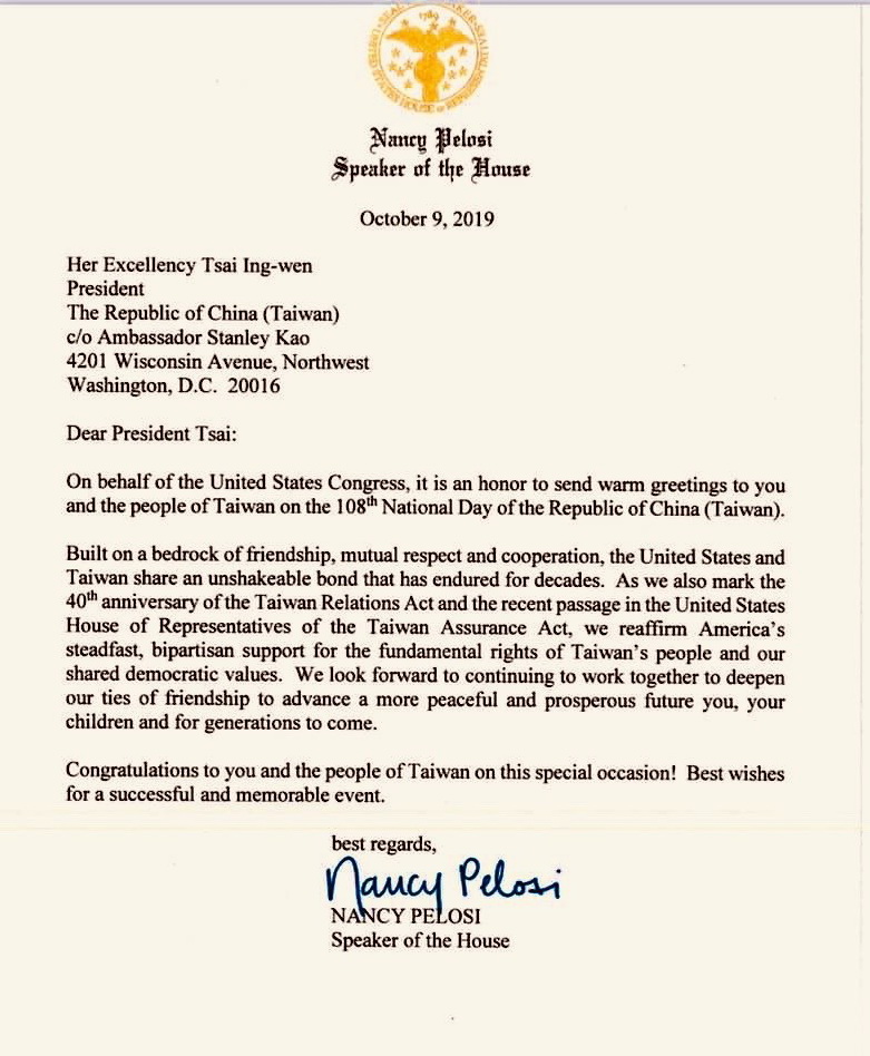 駐美代表處昨日在雙橡園舉辦中華民國108年國慶酒會,會中特別宣讀裴洛西的賀電。裴洛西在這封給「中華民國總統蔡英文」的賀電中表示,她「很榮幸代表美國國會,在中華民國(台灣)108年國慶日向您與台灣人民致上熱切問候」。她並且說,美台在友誼、相互尊重與合作的基石上,有著數十年「不可動搖的紐帶」,關係堅定不移。